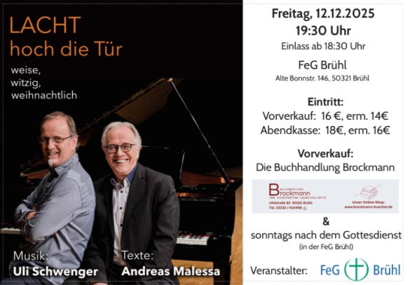 Ein Klavier-Virtuose und ein „Goldschmied der Worte“ garantieren dagegen Entspannung pur bei kabarettistischen Moderationen und berührenden Impulsen lebenskluger Spiritualität. Und Hörgenuss!!