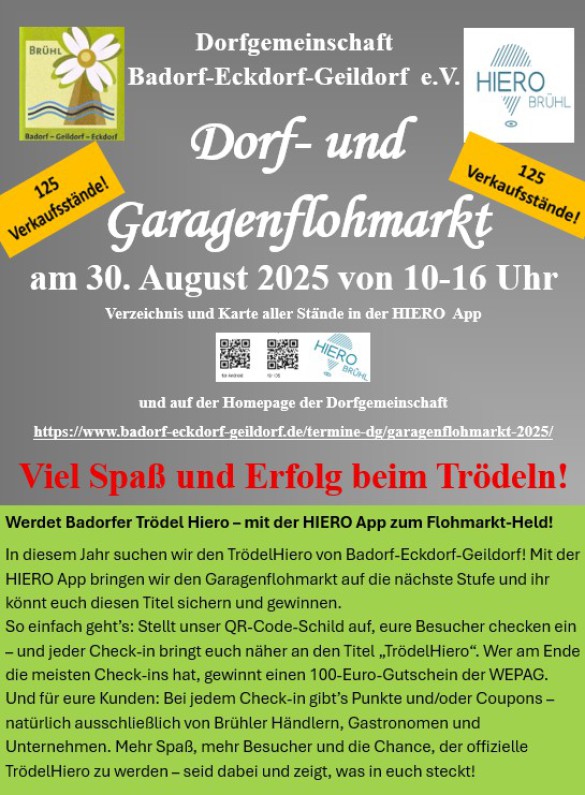 30. August 2025 von 10-16 Uhr im Trippelort Badorf-Eckdorf-Geildorf Viel Spaß und Erfolg beim Trödeln
