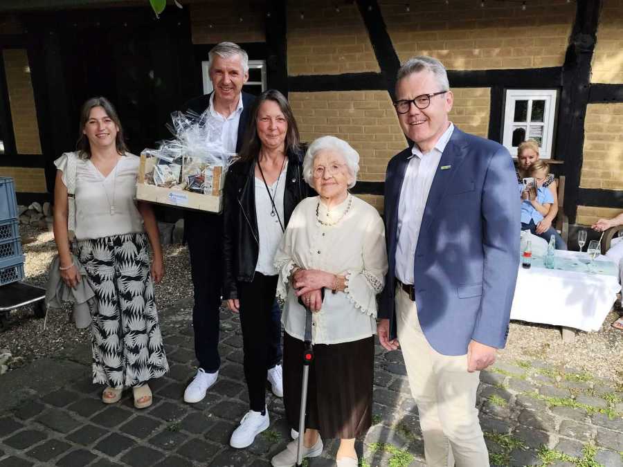 Von li. Beisitzerin Nicole Reusch, Kassierer Hubert Bollenbeck, stellv. Vorsitzende Iris Immeler, die Jubilarin Frau Gertrud Pütz und Dorfgemeinschafts Vorsitzender Manfred Bengsch